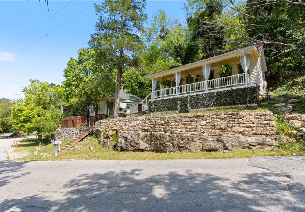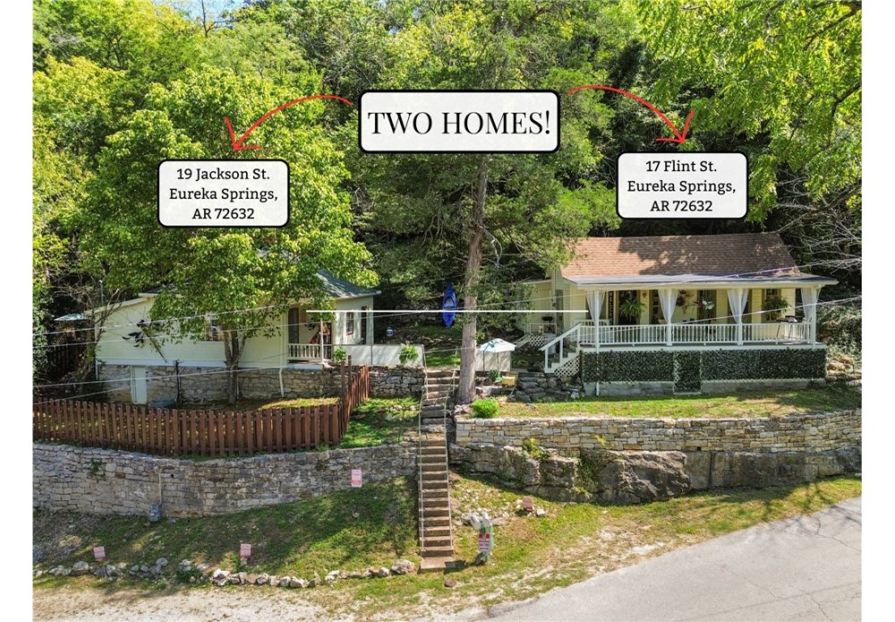 Two historic properties located in the Heart of Eureka Springs and within walking distance to historic downtown! This offering includes two adjoining properties with a shared courtyard - both dating back to the early 1900's. You get the benefits of all the historic charm with modern comforts. 19 Jackson St. is a 1-bedroom retreat complete with a spacious bath that offers a cast iron tub, tiled shower, and stackable washer /dryer. Flexible living space allows for an office, sitting room, or a second bedroom. 17 Flint St. is a 1-bedroom and 1 bath slice of heaven with its full front porch overlooking historic Main Street and the Grand Central Hotel. Full of charm with its whimsical murals, custom woodwork, and luxurious finishes. Both homes being sold with furniture, lamps, rugs, and more. Hot tub to convey. A rare luxury, these homes boast a total of SIX off street parking spots! Just like Eureka Springs, these homes are full of charms and offer an escape unlike any other. Listed indi