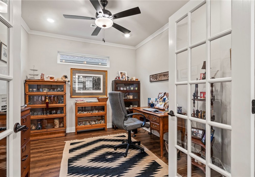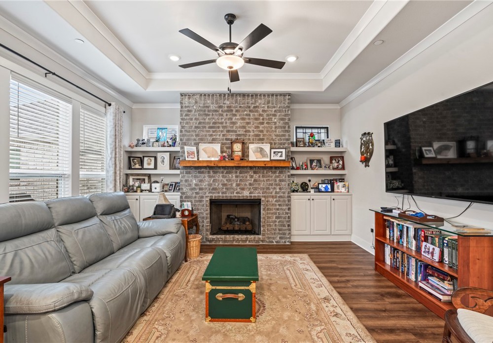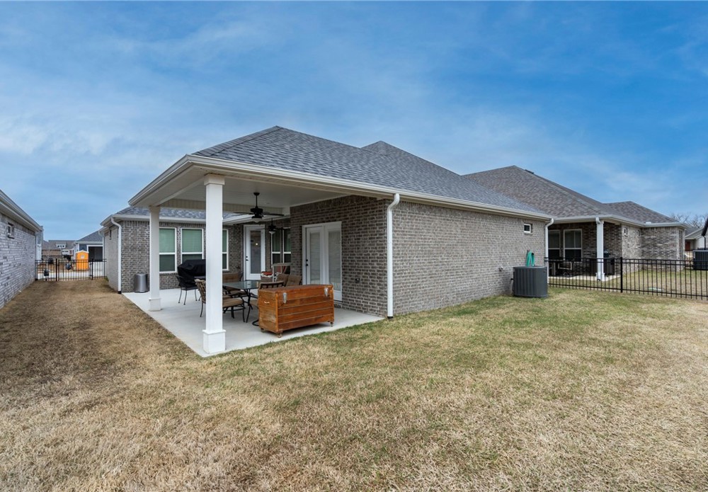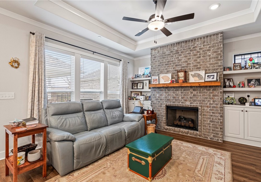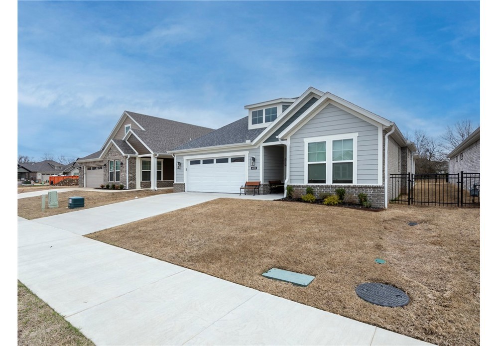 Enjoy relaxed, low-maintenance living in the sought-after The Courtyards at Owl Creek, a 55+ active adult community in West Fayetteville. This nearly new home features a bright open-concept design with 2 bedrooms plus a versatile flex room—perfect for a home office, study, or den. The inviting living area is centered around a gas log fireplace with custom built-in shelving, creating a warm and welcoming space to gather. Step outside to your private courtyard retreat with an upgraded covered patio overlooking Owl Creek and peaceful greenspace, accessible from both the living room and the spacious primary suite. The primary bath offers double vanities and a walk-in shower for everyday comfort. Enjoy true lock-and-leave convenience with HOA-covered lawn care, sprinkler maintenance, and snow removal. Future neighborhood amenities include a clubhouse and pickleball courts. Ideally located near trails, parks, shopping, dining, and quick access to I-49.