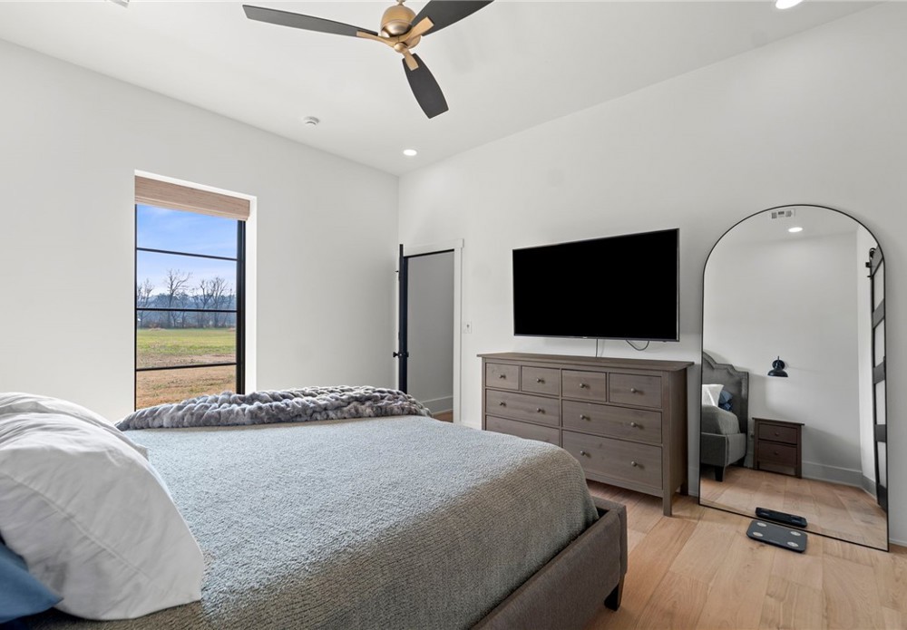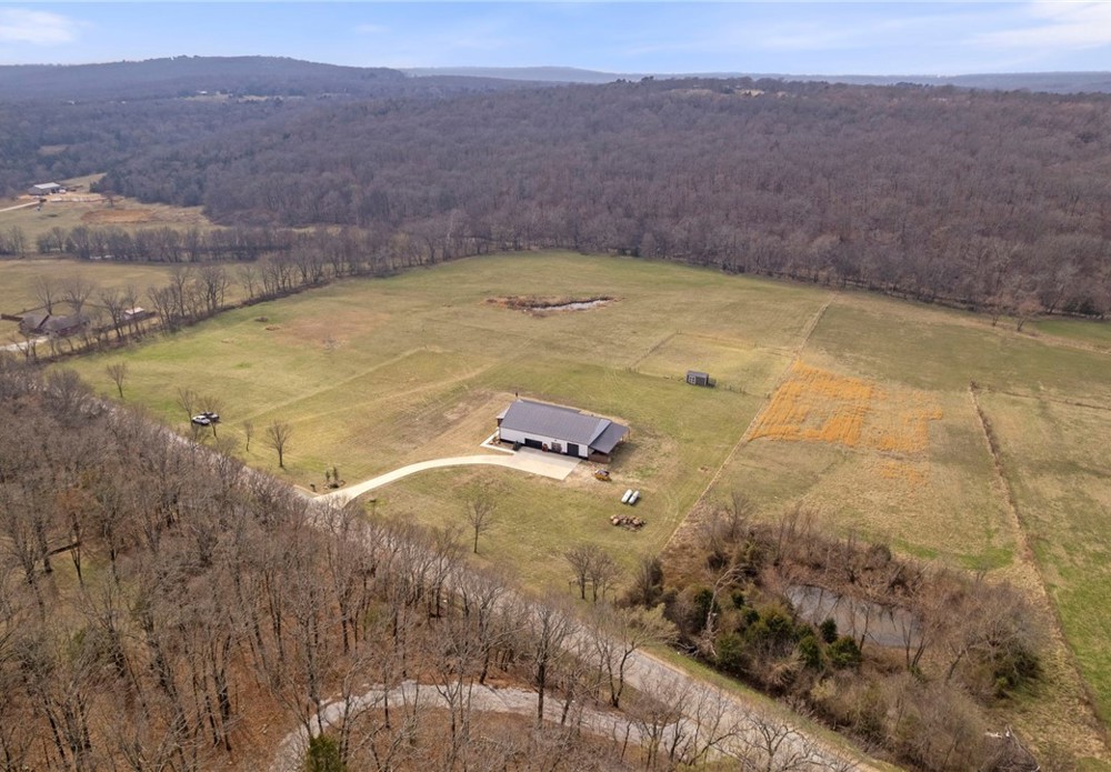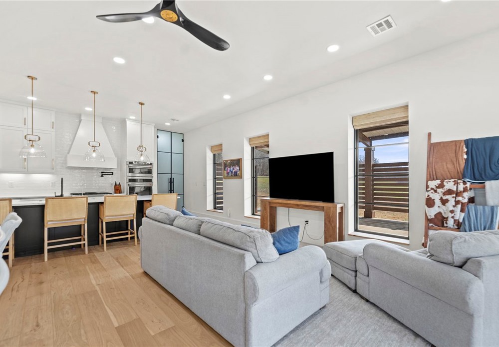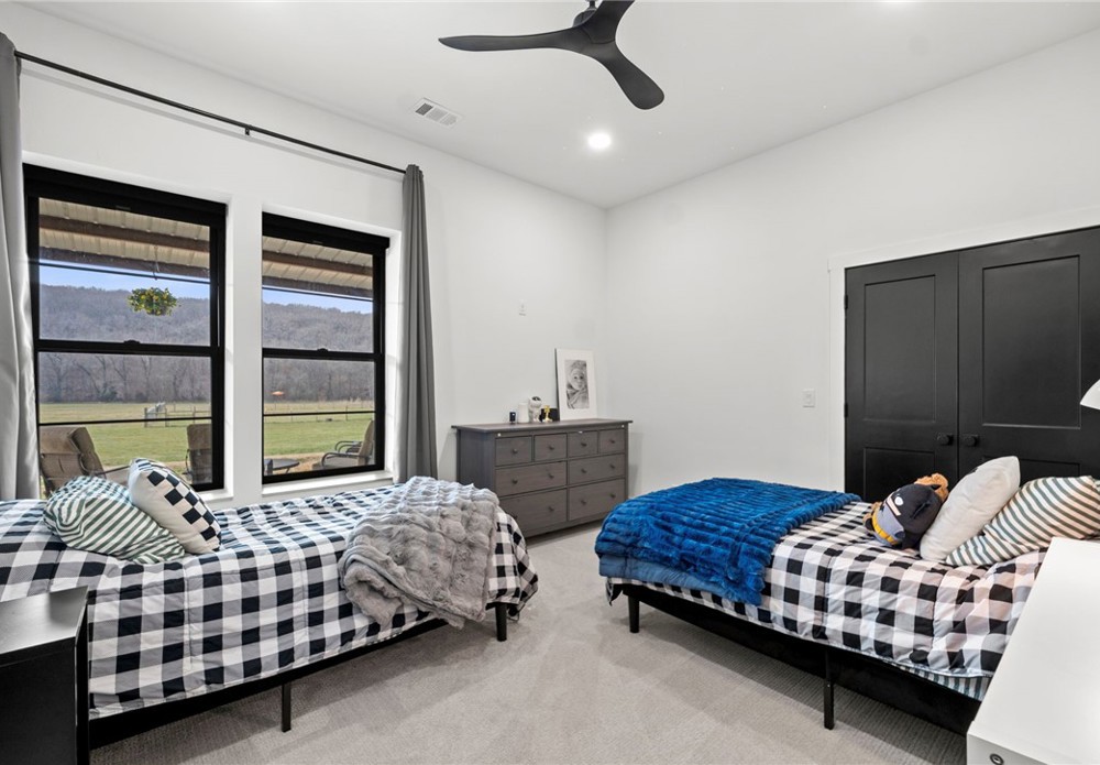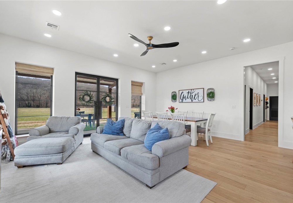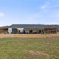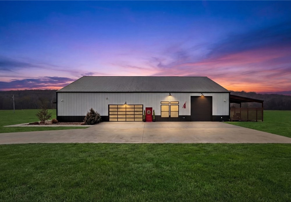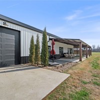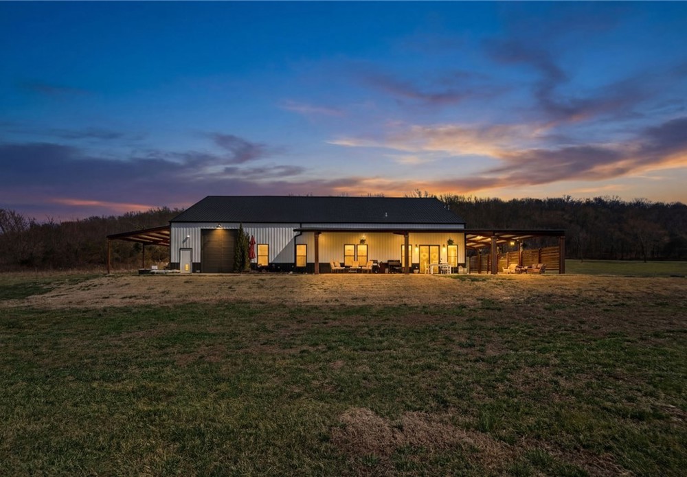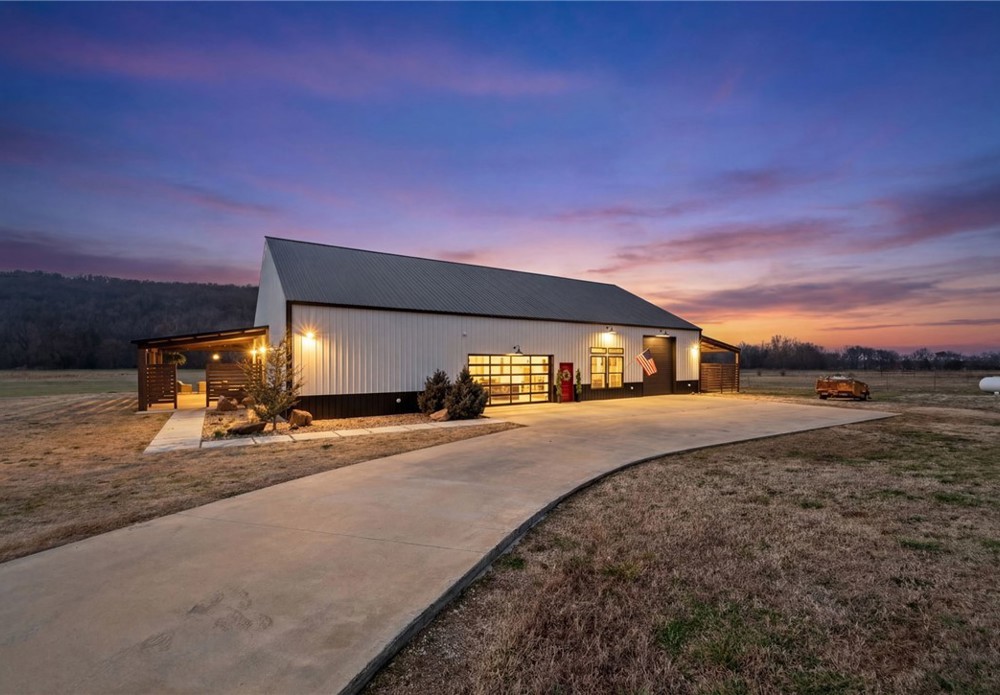 Modern farmhouse estate on 10 private acres in Prairie Grove with direct frontage along Sulphur Fork Creek. This 4-bedroom, 3-bath residence features 10-foot ceilings throughout, hardwood flooring, black-framed windows, red iron building construction and a seamless open layout designed for both entertaining and everyday living. The chef’s kitchen offers custom cabinetry, double ovens, an oversized island, and an expansive walk-in pantry. Dedicated office and bonus room provide flexibility. Outdoors includes a private pond, covered patio, and a 1,000 sq ft shop with 12-ft pull-through doors on both sides. A rare blend of refined design and functional acreage.