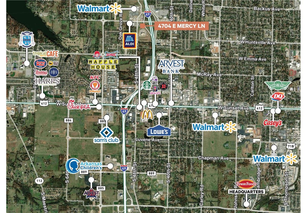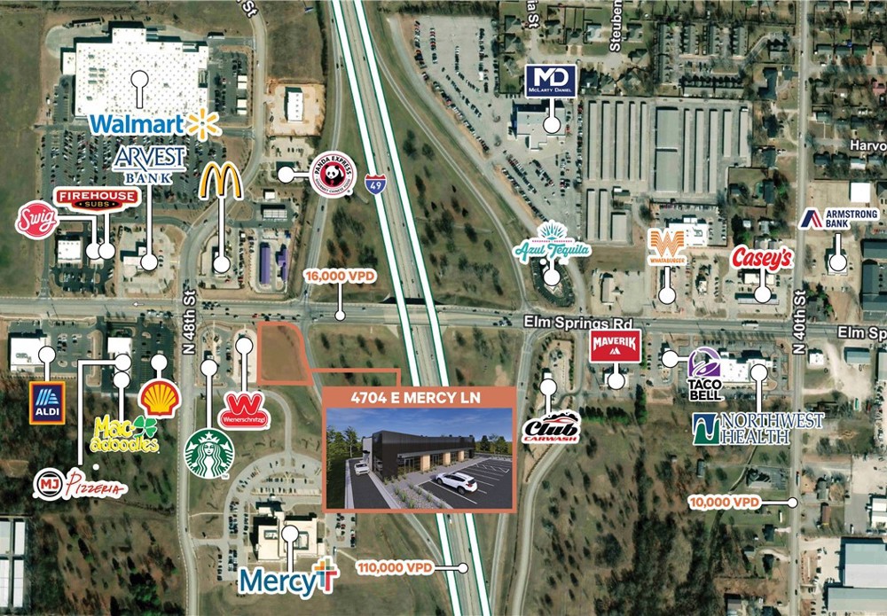 Prime retail space available for lease at 4704 Mercy Ln, Springdale, AR 72762, offering excellent visibility from I-49 and Elm Springs Road (16,000 VPD). This new construction (estimated Q4 2026 delivery) features ±4,877 SF divisible into four suites, including a drive-thru opportunity for Suite 101. Located in a high-traffic area surrounded by major retailers and residential developments, this property is ideal for businesses seeking significant exposure and growth potential in Springdale.
