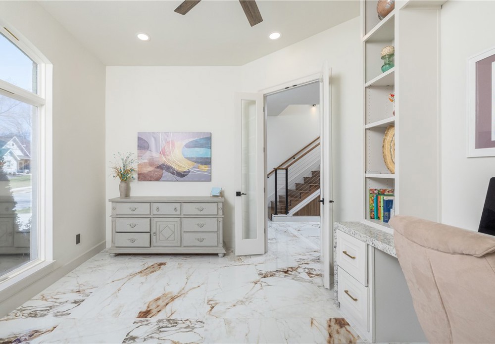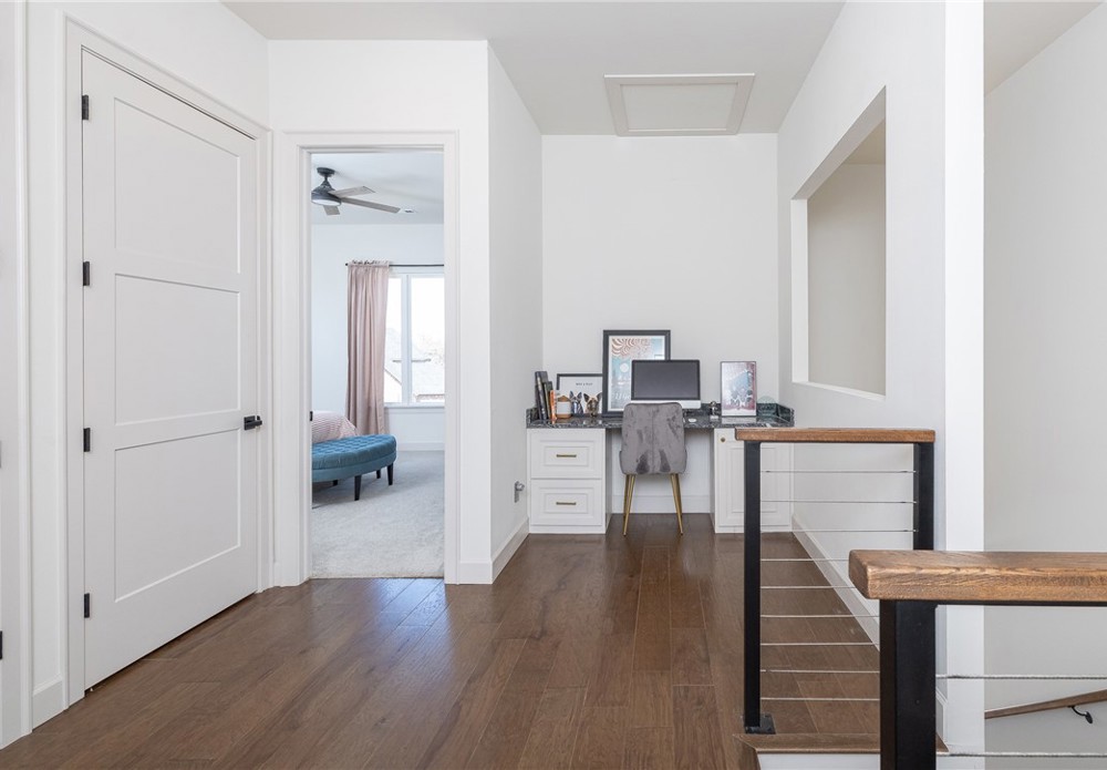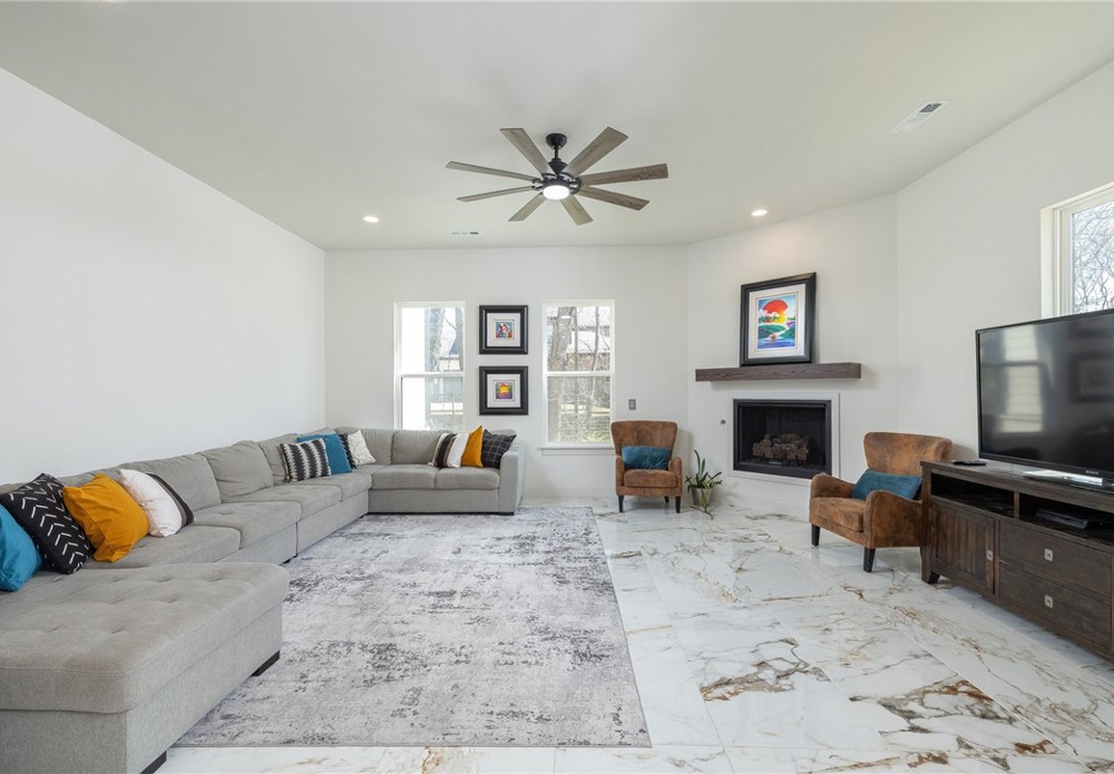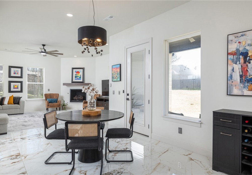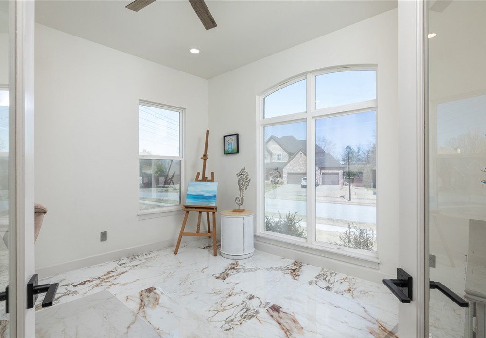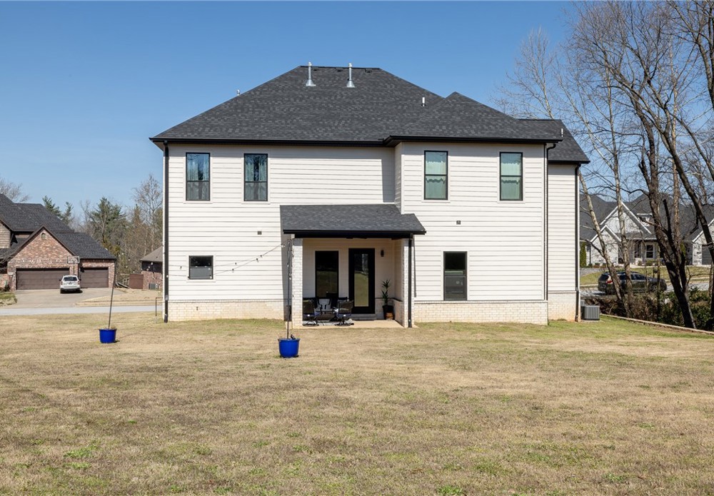 Like-new & beautifully maintained, this West Fayetteville home offers a clean, modern aesthetic with a functional open layout for everyday living & entertaining. Dedicated office with double door entry & built-in desk sits just off the entry, along with a convenient half bath. Beautiful tile flooring runs throughout the main living areas, connecting formal dining to the kitchen with granite countertops, gas cooktop, microwave, pantry & large waterfall island, opening to the breakfast area & living room, anchored by a gas fireplace. Second level includes a landing with built-in desk, bedroom with ensuite bath, two additional bedrooms & a full bath, plus a spacious primary suite with two walk-in closets & a spa-like bath with walk-in shower, soaking tub & dual vanity. Set on a 0.55-acre lot with tree preservation for added privacy, the home includes a covered patio for outdoor living. Neighborhood offers a pool & playground with easy access to I-49 and close to parks, dining, shopping & everyday conveniences.