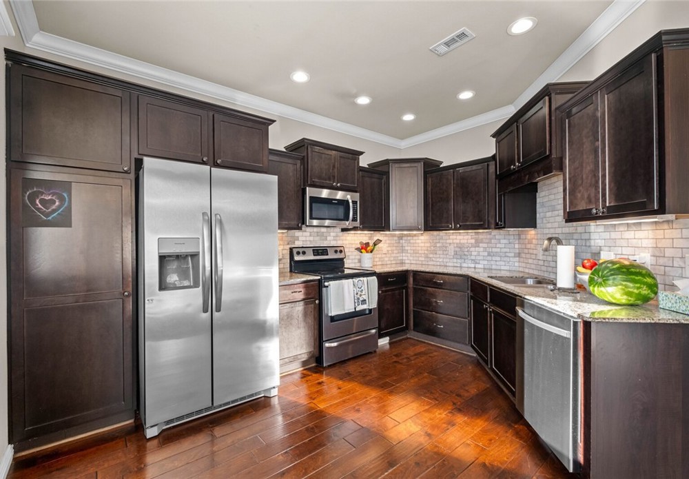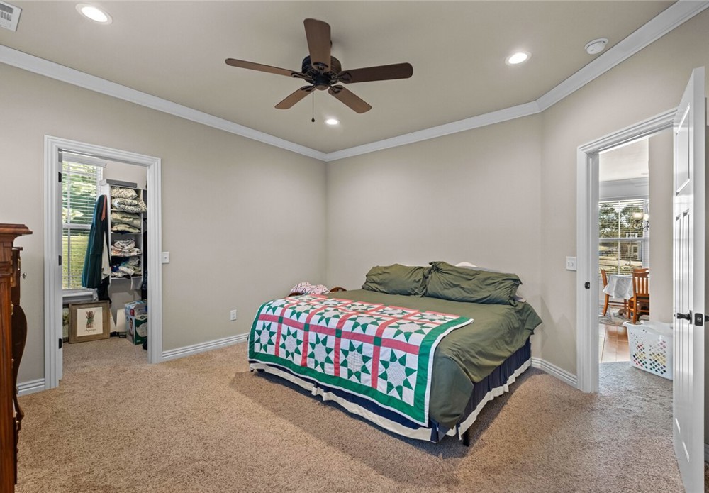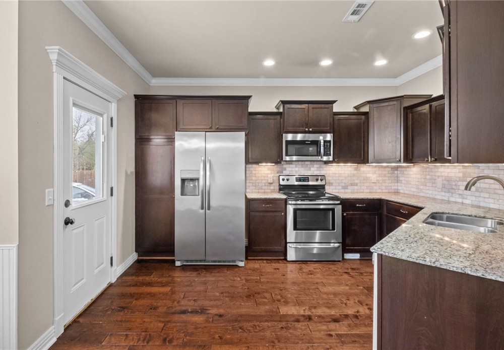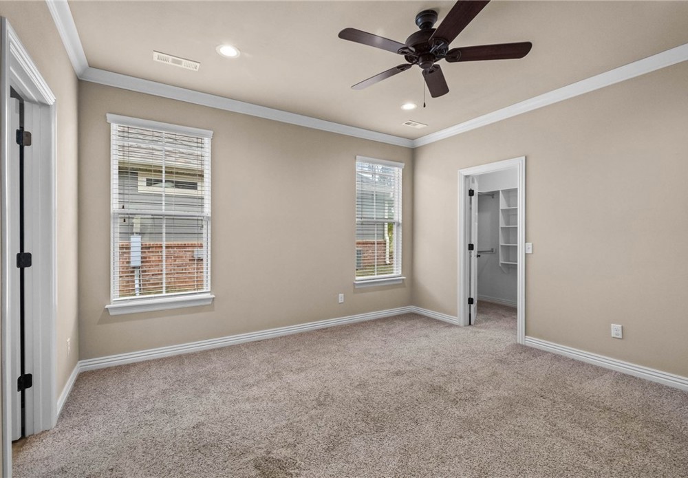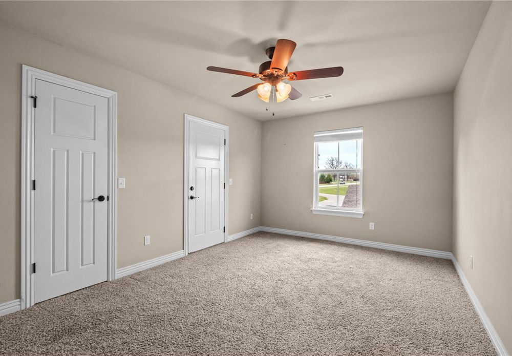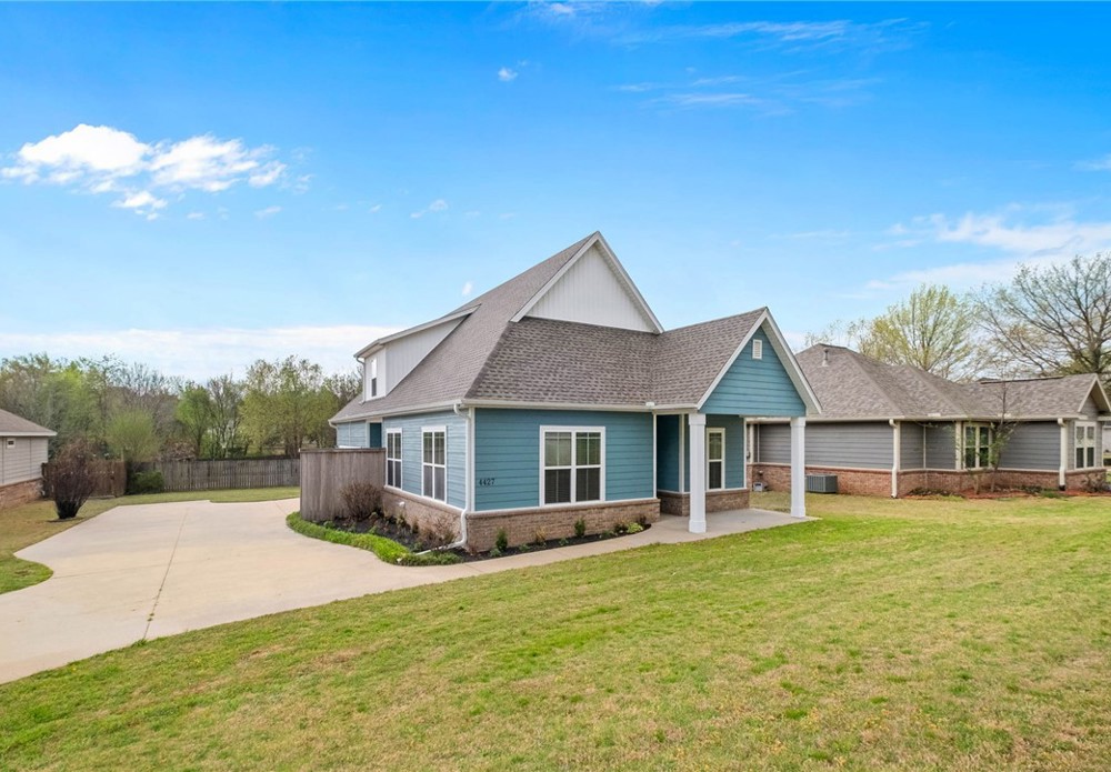 Family home tucked back on a private street with many recent updates that include a brand-new roof, fresh exterior paint, professional landscaping, and stylish interior touches—making this home truly move-in ready. Living room features wood floors, crown molding, a cozy gas fireplace, and expansive windows that fill the space with natural light. The kitchen offers granite countertops, stainless steel appliances, lots of cabinets, new dishwasher and the refrigerator conveys. The main level hosts a spacious primary suite with walk-in closet and ensuite with dual vanities and tiled shower. A second guest bedroom or a great office is also on main floor with another full bath and laundry. Upstairs, two additional bedrooms and a full bath provide a perfect private teenager retreat. Enjoy the backyard with direct Greenway access for biking and running. Large walk-in attic offers exceptional storage. Just minutes from I-49, University of Arkansas, and nearby schools, so would also make a great investment for college kids.