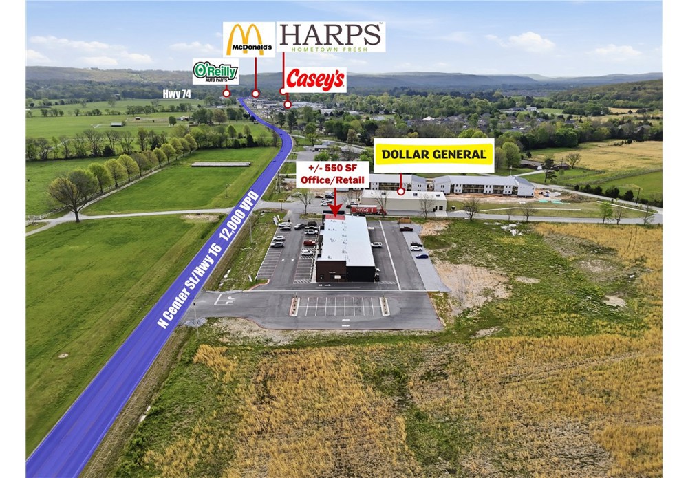 Now available, this +/- 550 SF office/retail space offers an efficient, open layout for a showroom, boutique retail, or flexible workspace. Located within a new construction building, the suite features a wide open floor plan and private restroom, providing a clean and modern setting ready for immediate occupancy. Positioned just off N Center St/Hwy 16 with approx. 12,000 VPD, the property benefits from steady traffic and strong surrounding retail presence. It is conveniently located near Harps Food Stores and McDonald's within one mile, and just half a mile from Casey's General Store, with Dollar General next door. Ample on site parking and a NNN lease structure make this an attractive opportunity for a variety of users seeking a well located, move in ready space.